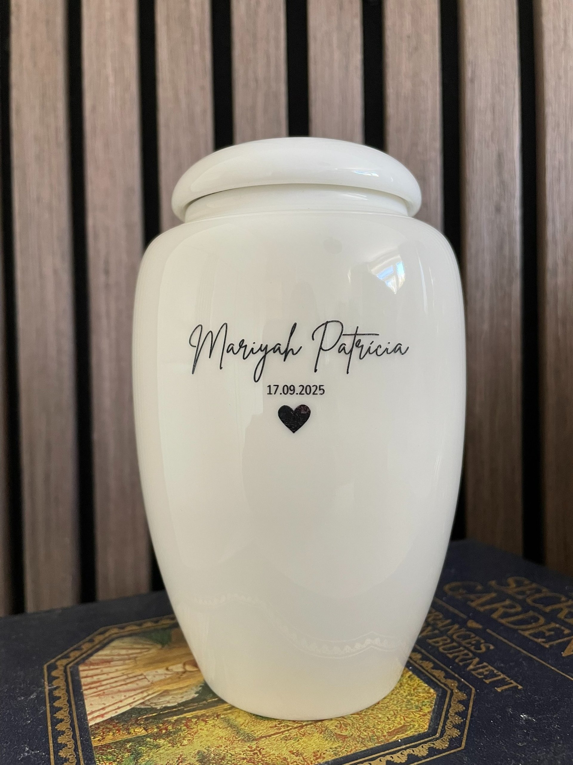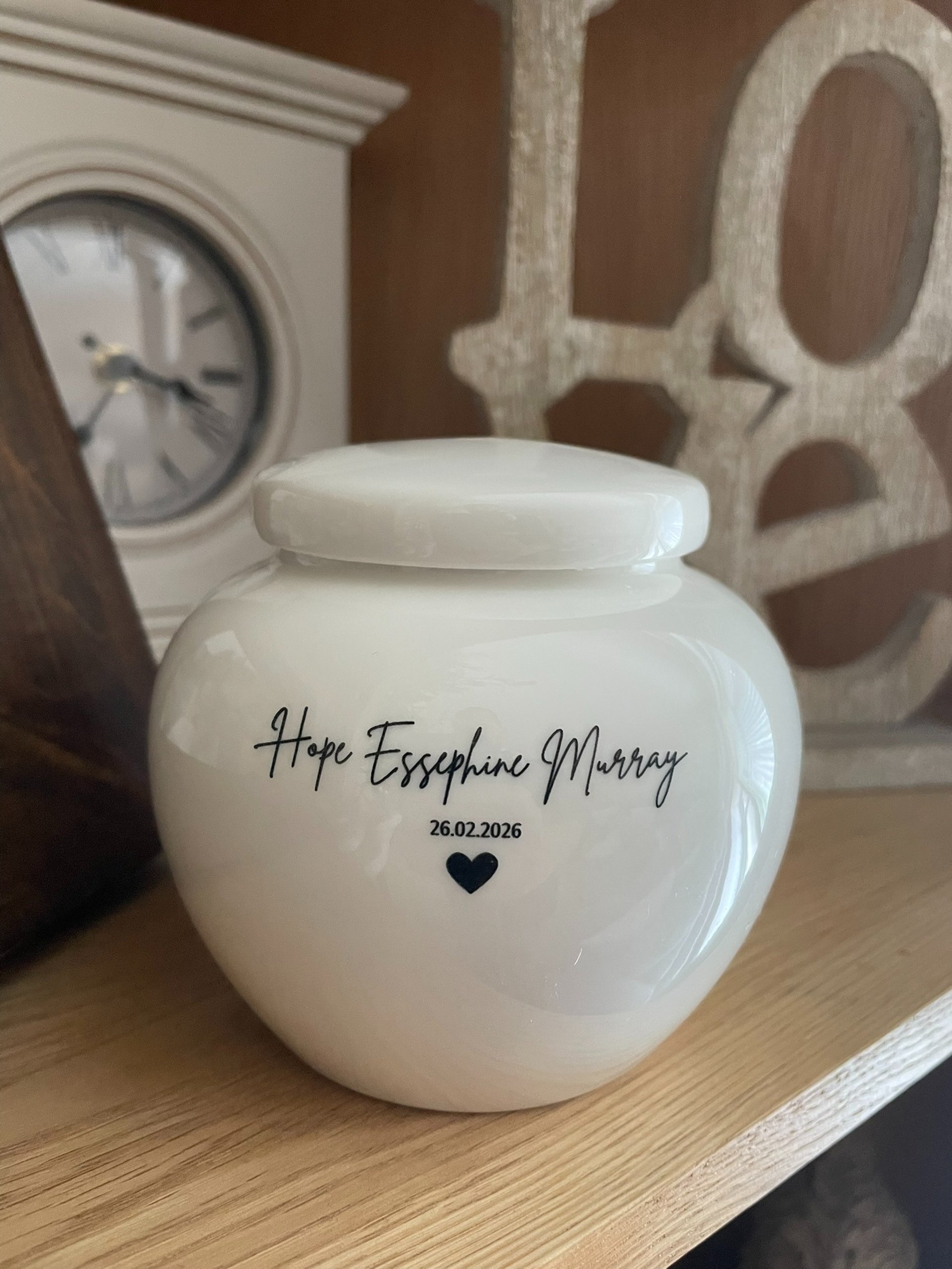Our personalised stillborn and infant memorial urns are handcrafted from high-quality glazed ceramic, created as gentle and timeless tributes for baby ashes. Each baby ashes keepsake is made with care and intention and engraved to a high standard — they truly are a delicate memorial that reflects innocence, purity and the unbreakable bond between parent and child.